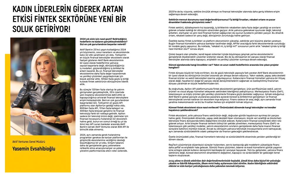 Aktif Bank’ın 25’inci yaşını kutladığımız 2024 yılı büyümenin, cesur kararların ve ekosistemde kalıcı bir etki yaratmanın yılı oldu. Türkiye’nin en büyük finansal teknolojiler ekosistemi olarak faaliyet gösteren Aktif Bank ekosisteminin bir üyesi olarak hedeflerimiz yalnızca sayısal başarılarla değil, dönüştürdüğümüz iş modelleri, güçlendirdiğimiz iş birlikleri ile anlam kazandı. Bu yıl, finansal teknolojiler ekosistemine daha fazla değer kazandırmak ve yenilikçi çözümleri yaygınlaştırmak için büyük adımlar attık. 50’den fazla güçlü iş birliği kurarak fintek sektörünün dönüşümüne liderlik ettik. Bu süreçte 120’den fazla startup ile yatırım görüşmeleri gerçekleştirdik, 35’in üzerinde yeni müşteriyi ekosistemimize dahil ettik ve kapsayıcılığımızı artırarak finansal teknolojilere erişimi kolaylaştırdık. Beni en çok gururlandıran başarılardan biri, Türkiye’nin en güçlü API platformu olan Apilion’un geldiği nokta oldu. 800’den fazla API, 15’ten fazla kategori ve 400’den fazla bireysel geliştirici ile finansal teknolojiyi farklı bir noktaya getirdik. Apilion sadece bir teknoloji ürünü değil, işletmeler için finansal inovasyonu hızlandıran bir ekosistem haline geldi, bunun en somut örneği bu yıl da ikinci kez API sunan bankalar arasında Aktif Bank’ın iştiraki Aktif Ventures olarak 808 API ile birincilik elde etmemiz. 2024, aynı zamanda gerek hızlandırma programları gerekse de kariyer platformları ile girişimcilik ekosistemine verdiğimiz desteği büyüttüğümüz bir yıl oldu. Girişim tabanını daha da genişleterek genç yeteneklere rehberlik etme amacıyla kariyer ve yetenek yönetimi platformlarında etkin roller üstlendik. 2025’te de bu vizyonla, sektöre öncülük etmeye ve finansal teknolojiler alanında daha geniş kitlelere erişim sağlamaya devam edeceğiz.
